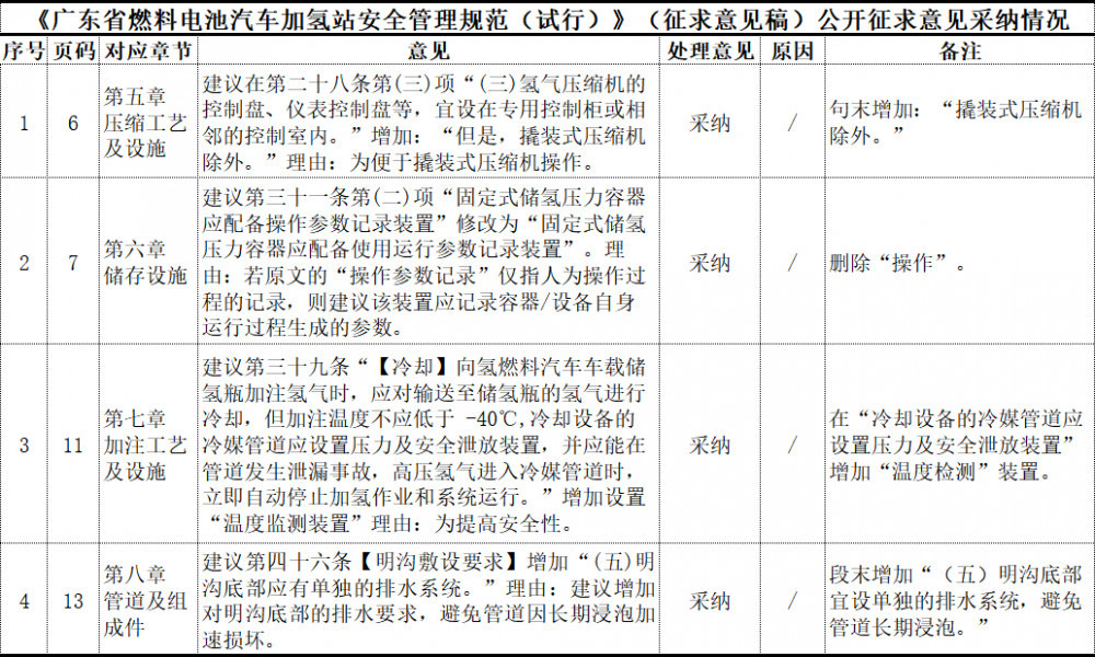 4月26日,廣東省住房和城鄉(xiāng)建設(shè)廳亦發(fā)布了關(guān)于《廣東省燃料電池汽車加氫站安全管理規(guī)范(試行)》(征求意見稿)公開征求意見采納情況的公示。
