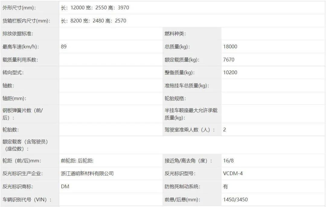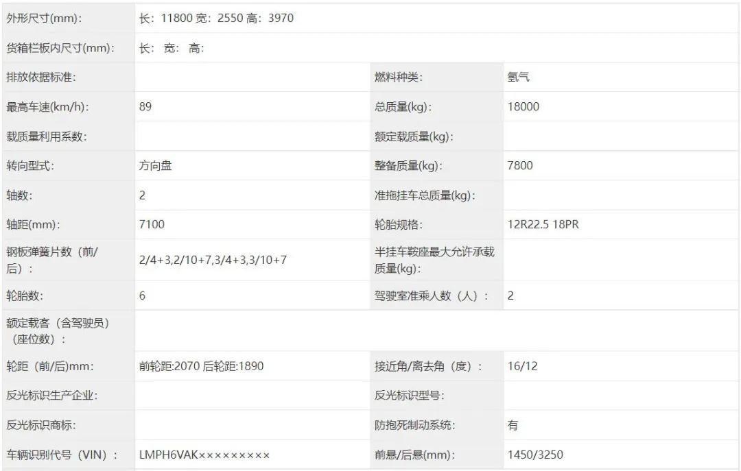 公示信息顯示,遠(yuǎn)程新款甲醇重整制氫載貨底盤產(chǎn)品型號DNC1188FCEVGMPJ1,外形尺寸11800×2550×3970mm,軸距7100mm。總質(zhì)量18000kg,整備質(zhì)量7800kg。