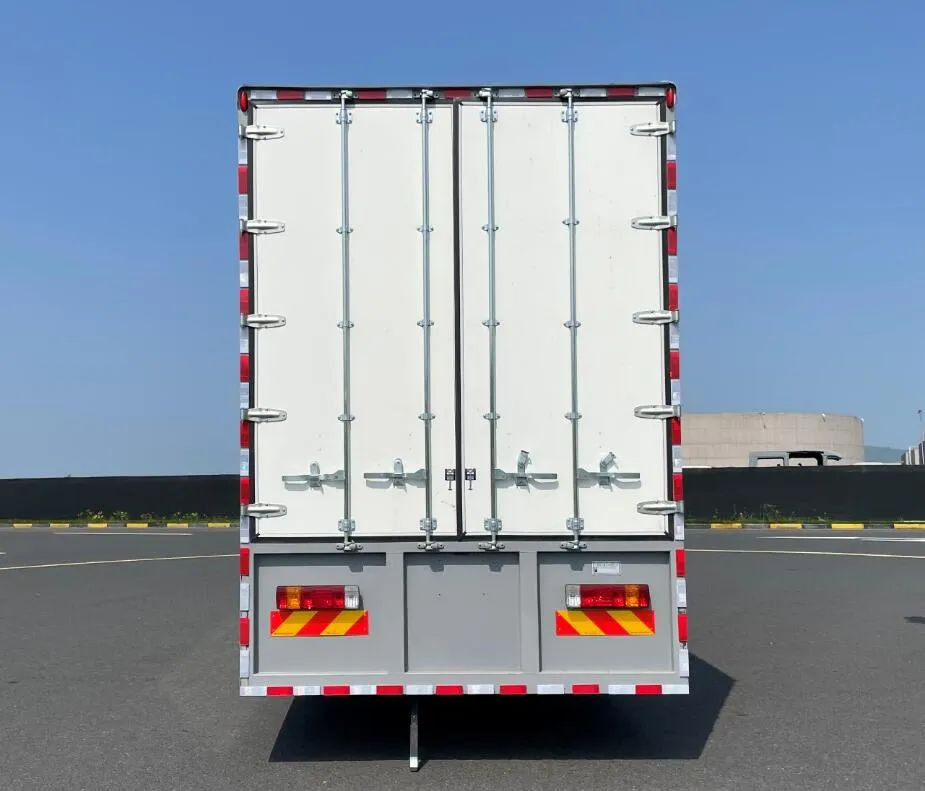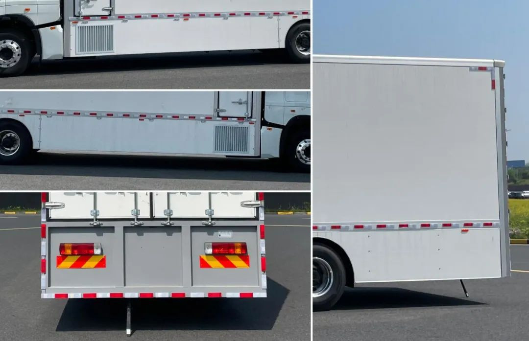 其他方面,車輛車廂頂部封閉不可開啟,側(cè)防護(hù)為裙邊結(jié)構(gòu),左右對稱。側(cè)防護(hù)所用材料為Q235A+熱塑性玻璃纖維增強蜂窩板,連接方式為螺栓連接。后防護(hù)為裙邊結(jié)構(gòu),后防護(hù)所用材料為Q235A,連接方式為焊接,后防護(hù)離地高度480mm,并可外接充電。